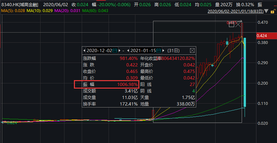 值得注意的是,域高金融股价此前一直在0.02港元附近徘徊,但从2020年12月2日启动,截至2021年1月15日,在短短的31个交易日里,股价一度暴涨超1000%。