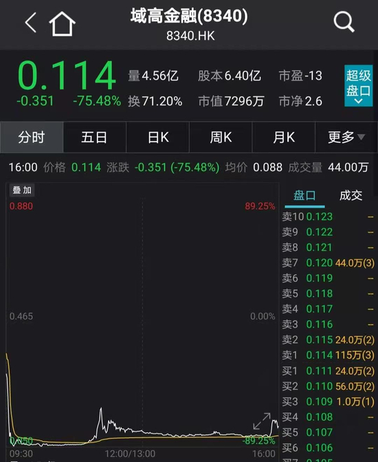 1月18日,开盘不到10分钟,域高金融就下跌超89%。截至收盘,该股仍居港股跌幅榜首,报0.114港元,最新市值7296万港元。