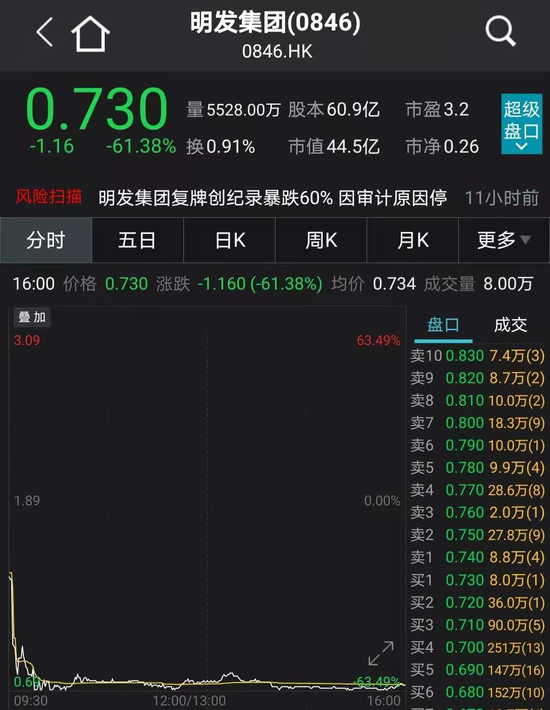 截止收盘,明发集团跌61.38%,报0.73港元。