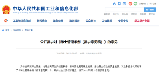 1月15日,工信部网站发布了《稀土管理条例(征求意见稿)》,向社会公开征求意见。征求意见稿共29条,明确稀土管理职责分工,稀土开采、冶炼分离投资项目核准制度,稀土开采和冶炼分离总量指标管理制度等,并强调加强稀土的全产业链管理,强化监督管理。