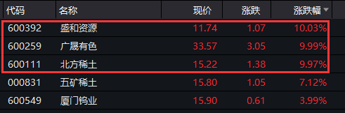 受上述消息刺激,稀土相关概念股成为全场最靓的仔。其中,大地熊盘中一度涨20%触及涨停,盛和资源、北方稀土、广晟有色等涨停。