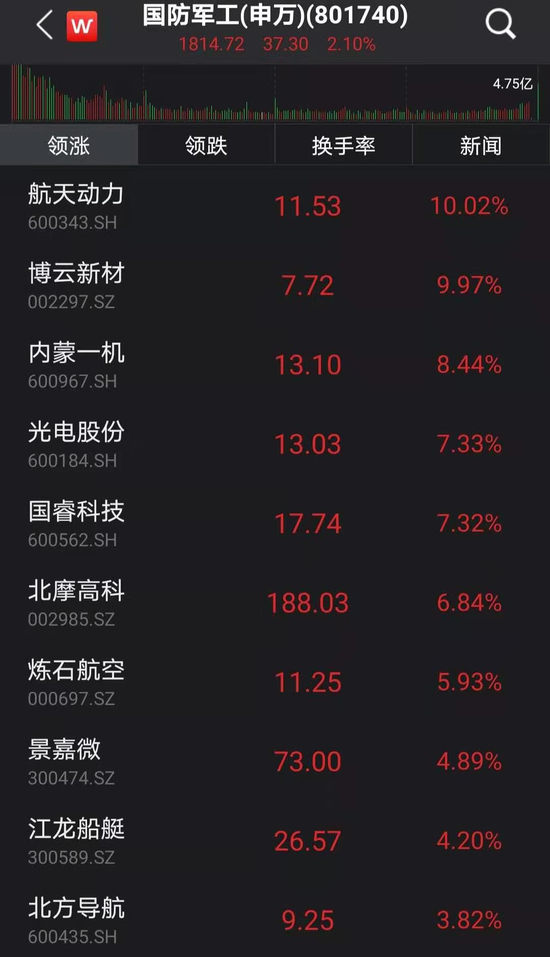 截至收盘,航天动力、博云新材涨停,内蒙一机、光电股份等跟涨。