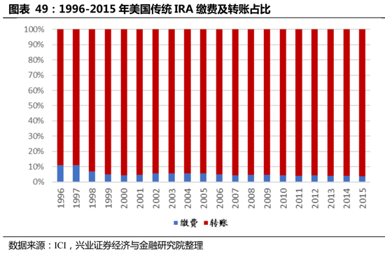从美国激励IRAs发展的政策来看,政策类型主要分为税收优惠与转移机制两种。税收优惠方面,以传统IRAs为例,个人可以依据收入情况,决定存入IRAs账户的缴费全部或部分在当前应税收入中予以扣除,缴费金额和投资收益可延期缴税。而与传统型IRAs相比,罗斯型IRAs更加灵活。一方面是可以提前支取已缴金额,并无需缴纳惩罚性的税金(但59岁半之前提取账户中的投资收益时,则大多时候需要缴纳10%税金),另一方面则是没有70岁半的年龄上限,人们在退休后依旧可以继续向账户中缴费,享受税优待遇。转移机制方面,IRAs具有良好的转移机制,户主在转换工作或退休时,可将401(K)计划的资金转存到IRA账户,避免不必要的损失。以传统IRAs为例,截至2015年(最新可披露数据),传统IRAs转账流入资产占比已高达96.29%,说明了转移机制对于IRA发展的极大促进作用。