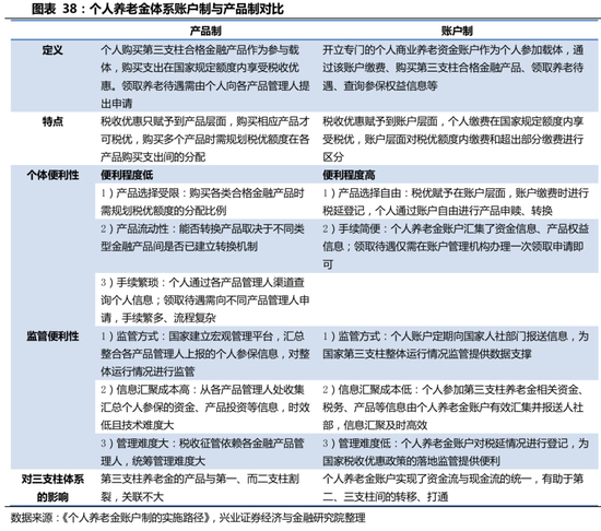 养老金第三支柱的实施制度分为产品制和账户制,当前我国养老金第三支柱实施产品制,未来将转向账户制,规范养老金第三支柱的实施制度。产品制下,国家税收优惠政策指向具体的产品类型,各类形态的金融产品的管理人直接面向个人提供税收代扣缴、待遇发放等服务。个人购买金融产品,需要考虑税收优惠额度的分配比例、产品间的转换机制、领取待遇的流程等。而国家对养老金第三支柱的税收征管与业务管理需要依赖各产品管理人,时效低且统筹管理难度大。账户制下,以个人养老金账户为主体参加第三支柱养老金各个环节的运转,产品制下分散的资金、产品、信息服务得以在账户层面集中。个人在账户制下,得以自由进行产品申赎、转换、办理领取待遇。而个人养老金账户登记的税延情况、有效汇集的相关资金、税务、产品等信息都便于国家税收政策的落地监管与把控业务运行整体情况。因此,从长远来看,产品制不利于第三支柱养老金的发展。而账户制则实现了资金流和信息流的统一,有助于业务的长远健康发展。