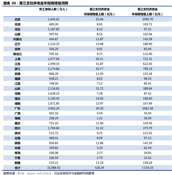5. 用同样的方法对全国各个省级行政单位(西藏与新疆建设兵团的数据缺失)的第三支柱个人养老金潜在规模上限做测算,最终得出全国第三支柱年养老金的潜在规模。