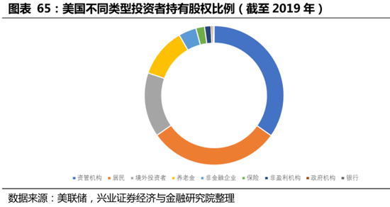 从入市程度来看,IRAs将近半数资产投资于共同基金,入市程度高。据ICI披露,IRAs对共同基金的资产配比达到44%,入市程度高,而对银行与储蓄机构存款/寿险资产/其它资产的配比则分别为5%/4%/47%。对共同基金的资产配比从1975年的1%到2019年的44%,说明了IRAs多年来对共同基金发展、美股机构化的推动作用。