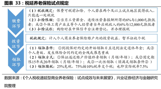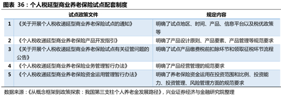 在第三支柱建设中,当前仅保险纳入税优范围,并出台配套制度,商业养老保险先发优势显著。自2018年4月启动税延个人养老保险试点后,有且仅有保险产品被纳入税收优惠范围。同时,在试点启动后,《关于开展个人税收递延型商业养老保险试点的通知》、《个人税收递延型商业养老保险产品开发指引》、《关于开展个人税收递延型商业养老保险试点有关征管问题的公告》等一系列配套政策文件下发,明确了试点地区、时间、产品、信息平台以及税优政策等基本要素,进一步巩固了养老保险的先发优势。