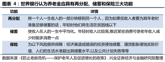世界银行于1994年提出养老金三支柱体系,以实现养老金体制的再分配、储蓄和保险三大功能。世界银行认为,一个国家的老年保障计划应具有储蓄、再分配和保险功能,而单一的养老金支柱无法实现这三大功能。因此,各国应建立由多层次的养老金筹资和管理体制,由多重老年保障支柱来分担养老责任。1994年,世界银行发布报告《防止老龄危机——保护老年人及促进增长的政策》,明确提出养老金三支柱体系:第一支柱为强制性税收融资的公共支柱,主要负责实现再分配功能;第二支柱为强制性积累的私人支柱(职业年金计划或个人储蓄),主要负责实现储蓄功能,而第三支柱为自愿支柱,对第一支柱与第二支柱起到补充作用。