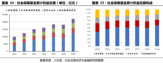 社会保障基金累计投资收益已超过万亿元,但占大头的基本养老保险入市程度低,通过投资增值以缓解收支压力的贡献程度仍待加强。社会保障基金方面,从权益总额的口径来看,截至2019年,累计投资增值已达到12464.06亿元,一定程度上缓解了财政压力。但占主体的基本养老保险方面,截至2020年三季度,基本养老保险委托社保理事会投资的金额共到账9757亿元,对基本养老保险总规模占比不足15%,入市程度低。而2019年基本养老保险委托社保理事会投资所获得的投资收益仅为663.86亿元。因此,受基本养老保险的低投资回报影响,总体来看,当前我国第一养老金支柱通过投资增值以减轻财政负担的能力仍有限。