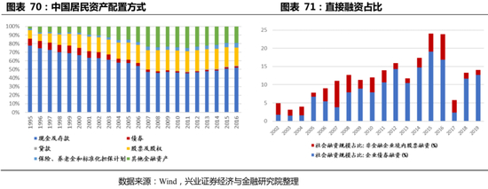 建设养老金第三支柱,能推动我国金融结构由间接融资向直接融资转型,形成与新经济相配套的融资结构。由于养老金体系不完善,居民资产重点配置银行存款和银行理财。截至2016年,中国居民财富中有51.99%用以配置现金及存款,这无助于我国“降低间接融资,增加直接融资”的金融结构调整,据增量法计算,2019年我国直接融资占比为14.1%,直接融资发展并不充分。由于新兴产业的融资风险偏好需求更高,银行的低风险偏好资金、信贷资金、间接融资模式不利于大面积直接支持新兴产业。在扩大养老金第三支柱的影响力后,我国金融结构得以进一步向直接融资转型,形成与新兴产业发展相配套的融资结构。
