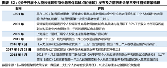 我国养老金第三支柱建设起步晚。早在1991年,我国就提出“逐步建立起基本养老保险与企业补充养老保险和职工个人储蓄性养老保险相结合的制度"。这是我国第一次提出养老金第三支柱。在十三五规划期间,《“十三五”规划纲要》、《人力资源和社会保障事业发展“十三五”规划纲要》等重要文件又多次提及“推出个人税收递延型养老保险”。2018年4月,财政部等五部门联合印发《关于开展个人税收递延型商业养老保险试点的通知》,宣布自2018年5月1日起,在上海市、福建省(含厦门市)和苏州工业园区实施个人税收递延型商业养老保险试点,试点期暂定一年。这一举措标志着养老金第三支柱建设正式进入政策实践阶段。