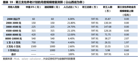 下文对第三支柱养老金给养老金体系带来的增量规模进行测算,测算的核心假设包括:1)以参加城镇职工基本养老保险的职工作为第三支柱的潜在参与群体;2)以salary calculator平台发布的《2020年全国各大城市薪资水平报告》中各省会城市就业人群工资水平分布作为各省就业人群工资水平分布的替代。3)2019年,个税免征额被上调为5000元,在此背景下,又将住房、子女教育、赡养老人等多项可抵税的支出考虑在内,参考《中国养老金融发展报告2018》,假定月收入在8000元以上者能够实际享受养老个税递延优惠,因此在测算时,我们假设月收入在8000元以上的人群均参与商业保险来获得规模上限。根据各省市城镇职工基本养老保险参加人数与salary calculator平台统计的全国各大城市薪资分布,分省测算各地去的第三支柱个人养老金规模,最后加总得第三支柱养老金给我国养老金体系带来的总体增量规模。