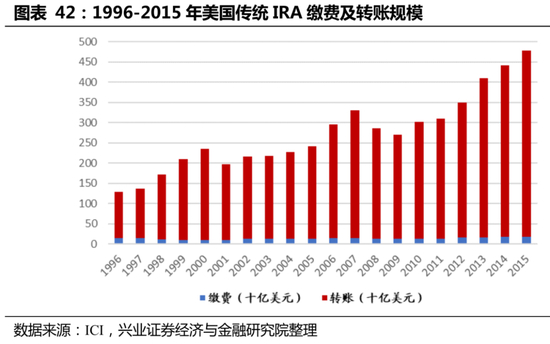 借鉴美国经验,未来的改革方向中或将出现对三支柱对接模式的探索。美国的个人退休账户(IRA)被赋予了“转账”功能,能够随时接收各类雇主养老金计划的“转账”资产。雇员在转换工作或退休时,可将401(k)等雇主退休金计划中的资金转存到IRA账户中,且不会改变其税收优惠地位。截至2015年(最新可披露数据),传统IRA转账流入资产达到4599亿美元,而个人缴费的资产仅为177亿美元。由美国经验可知,打通三支柱的对接模式,有助于第三支柱养老金的规模壮大。