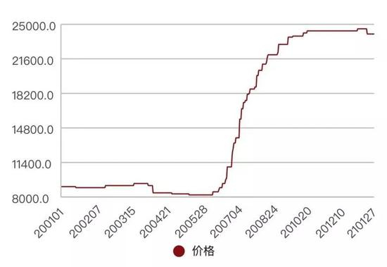 1月28日,PVC糊树脂手套料的价格为2.4万元/吨,而此前几年此种化工原料的价格一直稳定在每吨七八千元。来源:百川盈孚