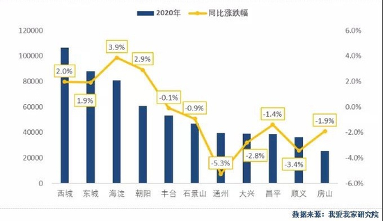 来自我爱我家的数据显示,与2019年相比,2020年均价上涨的有西城(2%),东城(1.9%),海淀(3.9%)和朝阳(2.9%),其它七个城区均下跌,其中通州跌幅最大,达5.3%。