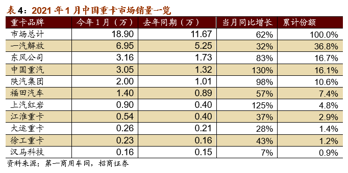 1月重卡销量再次刷新历史同期记录。据第一商用车网数据,2021年1月国内重卡销售约18.9万辆,同比增长62%,创造了重卡行业1月份销量的最高纪录,比上一历史记录——2019年1月(11.66万辆)多出了7.2万辆左右,截至今年1月份,重卡销量连续十个月刷新当月销量记录。分企业看,前五强格局整体稳定;1月销量一汽解放领跑,销量约6.95万辆,当月同比增长32%,东风公司和中国重汽均突破3万辆,其中东风公司销量当月同比上涨83%,中国重汽销量当月同比增长130%,行业整体保持高景气。