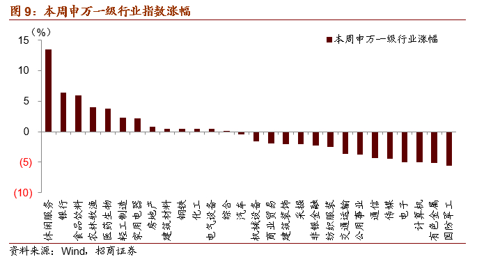 从风格上来看,本周必选消费、医药涨幅较大,TMT风格大幅下跌。从行业层面来看,本周28个申万一级行业涨跌参半,涨幅超过5%的板块有休闲服务、银行、食品饮料,涨幅居前的行业主要原因在于休闲服务(全球疫苗加速接种、出行复苏)、银行(业绩改善、估值修复、年末避险)、食品饮料(景气度、增量资金),跌幅超过5%的板块有有色金属、国防军工等。
