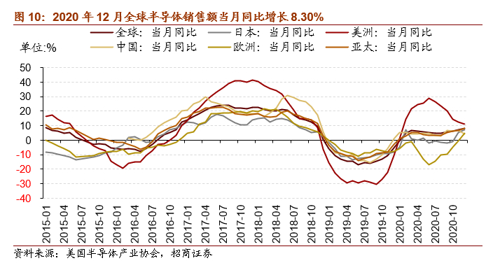 2020年12月全球半导体销售额同比继续上行,美洲、中国半导体销售额同比增幅有所收窄,日本、亚太地区和欧洲地区半导体销售额同比增幅扩大,欧洲地区增幅实现2019年2月份以来首次转正。根据美国半导体产业协会统计数据,12月全球半导体当月销售额为391.6亿美元,同比上行8.30%,比11月份增幅扩大1.3个百分点。从细分地区来看,美洲半导体销售额为83.6亿美元,同比增长11.10%,较11月涨幅收窄1.4个百分点;中国地区半导体销售额为133.4亿美元,同比增长4.40%,涨幅收窄2.1个百分点;亚太地区半导体销售额为241.6亿美元,同比增长8.00%,涨幅扩大1.2个百分点;日本半导体销售额为32.8亿美元,同比上涨7.30%,涨幅扩大2.2个百分点;欧洲地区半导体销售额为33.6亿美元,较去年同期上涨4.70%,自2019年2月以来增幅首次转正。