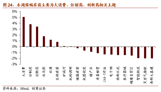 本周市场上涨,Wind全A指数周度上涨0.18%,创业板指涨2.07%,沪深300涨2.46%。本周涨幅居前的主要为大消费、仿制药、创新药相关主题。