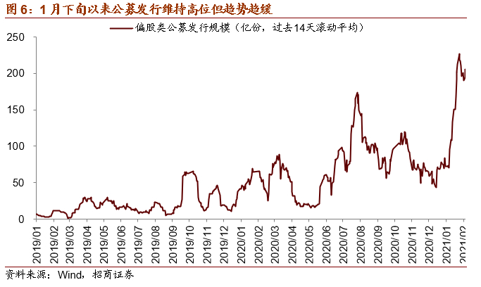 因此,我们需要关注公募基金新发的情况,如果发行规模越来越大,那就很可能强者恒强,但是如果新发规模趋弱,那可能就会缺乏场外增量资金支持。而1月下旬以来,公募发行维持高位,但是趋势趋缓,我们需要关注这种现象的未来的趋势。