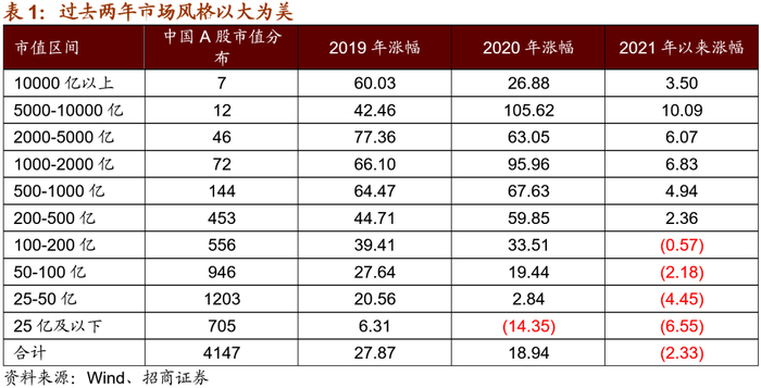 【观策·论市】2020年四季度以来,A股和美股的中小市值公司出现了严重背离,A股中小市值公司整体出现大幅调整,而美股中小市值公司却大幅上涨。美股呈现小票占优的特征。反应了经济基本面的改善和流动性的边际趋弱。但A股却呈现相反的景象,市场普遍认为:1)中国经济增速在下台阶,份额向龙头集中,因此中小公司已经没有机会了;2)当前居民申购基金,基金头部化集中,头部基金经理只买大票;3)A股注册制推进,会逐渐“美股化”“港股化”,很多中小盘逐渐没有成交;4)中国经济增速稳步下台阶,利率中枢会逐渐下行,能够有稳定增长或者ROE比较高盈利能力确定的公司将会非常稀缺,给多高的估值都不为过;5)未来货币政策趋紧,所以大家要拥抱大盘、现金流稳定、高ROE标的;6)A股趋势投资更加重要。我们对这些观点进行了一定探讨,这些观点有些很正确,有些是统计学偏差,有些是片面的,总的来说,当前中国面临的也是经济基本面改善,盈利增速加速上行而流动性趋弱。这种环境和基本面对应的风格特征将会逐步呈现“价值回归”的特征,两类价值:一类是意思就是PEG≤1或者GARP策略可能会回归,增速较高,估值性价比较高的中小价值风格,以及估值处在历史低位短期业绩增速明显回升的大盘价值风格会逐渐回归。