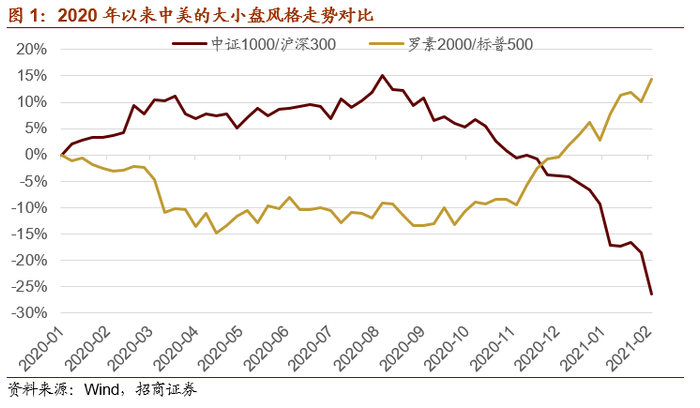 2020年四季度以来,A股和美股的中小市值公司出现了严重背离,A股中小市值公司整体出现大幅调整,而美股中小市值公司却大幅上涨。我们分析了背后的逻辑和原因是因为,美国大小盘风格取决于经济趋势,去年四季度以来美国经济加速改善, 市场对于成长性较高的中小市值公司重回青睐,同时,美国利率中枢开始上移,业绩重要性愈加重要。而疫情中,美国产生了很多新的消费趋势。所以,美股呈现小票占优的特征。反应了经济基本面的改善和流动性的边际趋弱。