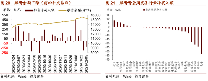 两融方面,融资资金在前四个交易日净流出122亿元,净流出规模收窄。从行业偏好来看,本周融资资金净买入的行业主要包括化工、汽车、电气设备等,不过净买入规模均不高;大幅净卖出的主要为电子、计算机、非银金融、军工等。从个股来看,融资净买入较高个股包括宁德时代、中国平安、上海机场等,净卖出较多的主要包括京东方A、航发动力、兴业证券等。