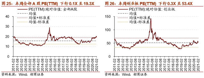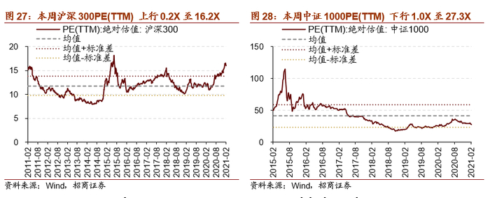 本周全部A股估值水平下行。截至2月5日收盘,全部A股PE(TTM)下行0.1X至19.3X,处于历史估值水平的89.6%分位数。创业板本周下行,PE(TTM)下行0.3X至53.4X,处于历史估值水平的62.3%分位数。代表大盘股的沪深300指数PE(TTM)上行0.2X至16.2X,处于历史估值水平的97.8%分位数。代表小盘股的中证1000指数PE(TTM)下行1.0X至27.3X,处于2014年以来历史估值的28.0%分位数。
