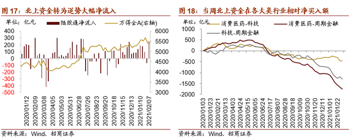 本周(2月1日~2月5日)北上资金逆势净流入,当周净流入253亿元。行业偏好上,北上资金净买入规模较高的为电气设备,净买入94亿元,远超其他行业;其他净买入较多的包括计算机、机械、医药等;交运、非银金融、家电等净卖出规模居前,不过总体净卖出规模较低。如果从大类行业来看,本周北上资金各大类板块的相对净买入额排序为周期金融>消费医药>科技。
