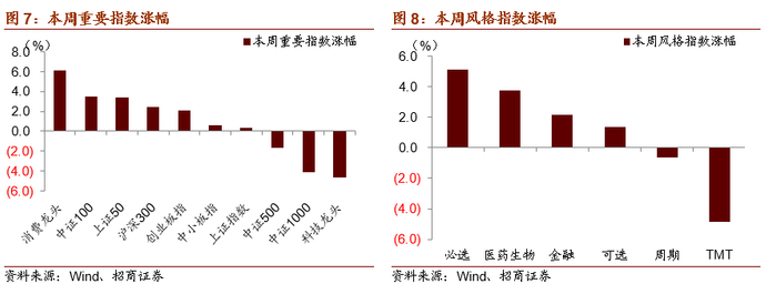 本周市场整体呈现出较为明显的分化行情,其中消费龙头、中证100、上证50 大幅上涨,中证1000、科技龙头指数大幅下跌,市场风格分化较为显著,从成交来看,本周日均成交在不足9000亿,较前几周成交明显缩量,资金继续流入港股市场,南向资金全周净买入581.5亿港元,2021年以来净买入港股规模达3688亿港元,北向本周净流入规模为253亿,从大类板块上来看,必选消费、医药涨幅较大,TMT风格大幅下跌。