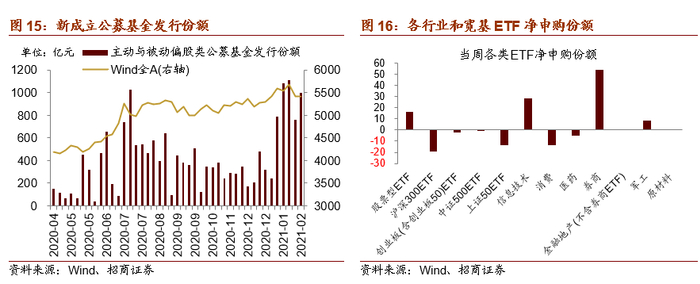 从ETF净申购来看,本周ETF转为大幅净申购,净申购16亿份;宽基指数类ETF以净赎回为主,信息技术、券商等行业ETF净申购;消费、医药类ETF净赎回。具体来看,股票型ETF总体净申购16亿份,对应资金净流出66.5亿元。其中,创业板、沪深300、上证50ETF分别净赎回2.3亿份、19亿份、13.5亿份。行业方面,信息技术ETF转为净申购28亿份;券商ETF净申购54亿份;军工ETF净申购8.5亿份;医药ETF净赎回4.7亿份。