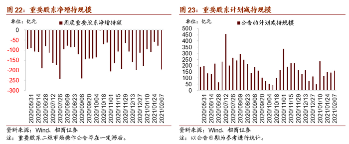 从资金需求来看,重要股东净减持规模较前期明显扩大,计划减持规模略有增加。本周重要股东二级市场增持29亿元,减持225亿元,净减持196亿元,净减持规模明显扩大,其中净减持规模较高的行业主要集中在电子、计算机、医药、机械等行业。另外,公告的计划减持规模159亿元,较前期略有增加。