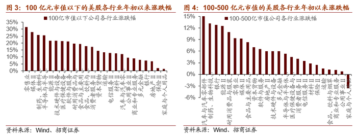 在这些中小市值公司中,医药、零售、媒体与能源行业涨幅较高。从不同市值区间公司各行业涨幅看,在100亿元市值以下的美股公司中,零售业、媒体、制药与生物科技行业年初以来涨幅较高,均在25%以上。此外,能源、技术硬件与设备、医疗设备与服务、软件与服务行业涨幅也在20%以上。在100-500亿市值的公司中,汽车与汽车零部件、制药与生物科技、银行、能源以及耐用消费品与服装行业涨幅较高,均在10%以上。这些涨幅较高的行业均属于当前景气度较高的行业,医药、媒体、软件等行业受益于疫情,汽车与汽车零部件行业受益于电动车渗透率提升,能源行业则受益于新能源的崛起。