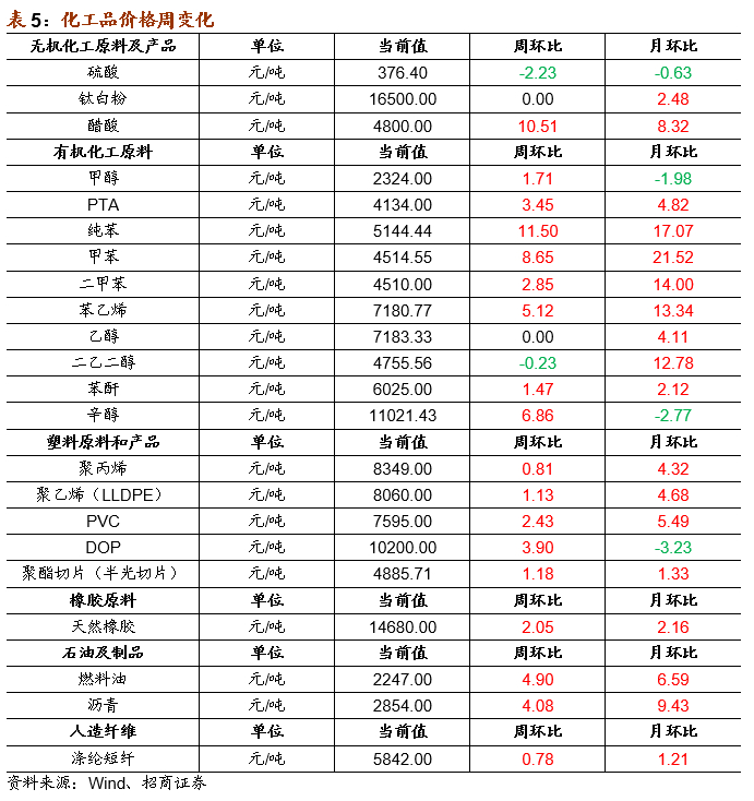 近期有机化工品价格多数上涨,燃料油、PTA、沥青等期货价格涨幅较大。截至2月5日,LLDPE期货结算价为8060.0元/吨,周环比上行1.13%;聚丙烯期货结算价为8349.0元/吨,周环比上行0.81%;燃料油期货结算价为2247.0元/吨,周环比上行4.90%;天然橡胶期货结算价上行2.05%至14680.0元/吨;沥青结算价上行4.08%至2854.0元/吨;甲醇期货结算价2324.0元/吨,周环比上行1.71%;PTA期货结算价为4134.0元/吨,周环比上行3.45%;PVC期货结算价上行2.43%至7595.0元/吨。