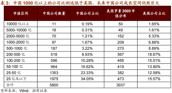 但是第二部分却很少有人提及,那就是,美国1000亿以上公司占比15.5%,共有470家,而中国公司占比3.4%,196家。那么随着中国经济体量的增长,逐渐接近或者超过美国,有大批100~1000亿的公司成长为1000亿以上,而部分100亿以下的公司会成长为200亿以上。