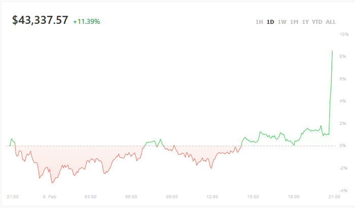 2月8日周一,比特币重回巅峰,站上4.3万美元大关。