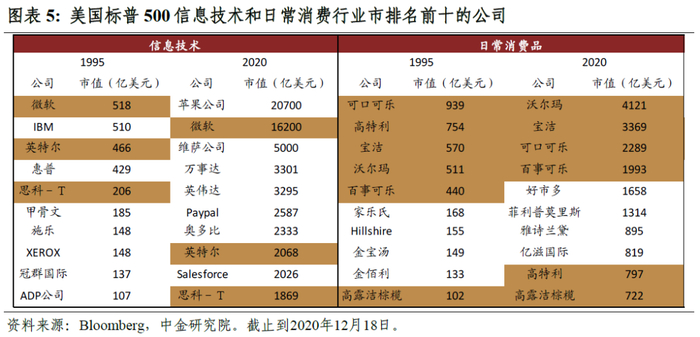 柯达和诺基亚两大巨头的倒掉,体现了一种“创新悖论”。因为创新具有供给创造需求的“萨伊定律”特征,即企业面对的需求是自身创新能力的函数,如果企业不创新,需求将萎缩、市场地位将瓦解,如果持续创新,市场地位也可能被自己的创新所颠覆。这种内在不稳定性,在两类行业的对比中体现的更为明显。以美国标普500为例,似乎在研发投入占比越高的行业,企业市值排序的稳定性越差(图表3、4、5)。1995年日常消费品市值排序前十的企业,有六家仍位列2020年的市值排序前十;但在信息技术行业,1995年市值排序前十的企业,只有三家在2020年仍跻身市值排序前十之列。这意味着,对于供给创造需求的行业而言,企业市场领先地位的稳定性显著低于需求决定供给的行业。