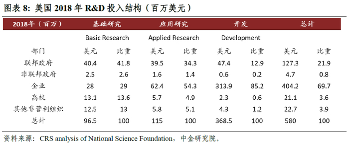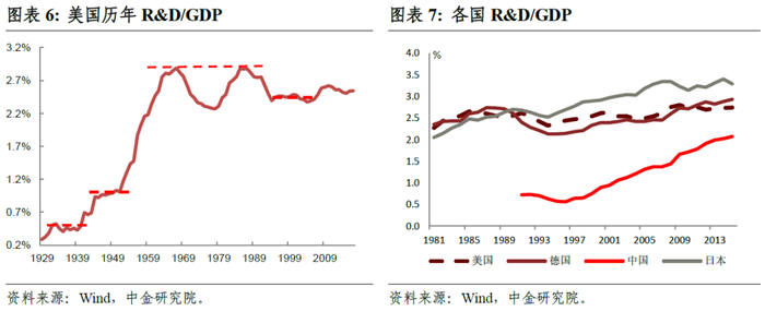 众所周知,科技是第一生产力。问题是,科技是如何进步的?就其短期和微观机制而言,并没有确定的结论,有的时候科技进步甚至是以某种可遇不可求的偶然形式出现。如果从经济史的长周期视角看,似乎可以得出一个基本结论:研发投入是科技进步的必要条件。美国研发投入强度(R&D/GDP)在1957年就已达到了2%,此后一直维持在2%以上;中国则是在2014年才达到了2%以上,从研发投入强度上看中国落后于美国57年。支撑美国数十年持续高研发投入的主要因素有两个:从外部看,是二战、冷战等激烈国际竞争带来的压力;从内部看,企业部门是研发投入的绝对主力,占到了美国总研发投入的约70%。