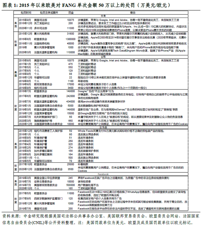 就经济学本质而言,竞争的一个重要特点应该是增加产出、压低价格,这样才有利于提升消费者剩余。如果从这个视角来看,亚马逊的行为无疑是促进了竞争的。既然如此,为什么会被欧盟委员会发起发垄断调查呢?我们进一步梳理了2015年以来,Facebook、亚马逊、苹果和谷歌四家美国平台公司所受到的单次金额50万美元/欧元以上的处罚。从金额上看,欧盟对FANG的累积处罚金额达到了253亿欧元,同期美国只有56亿美元。而且美国主要从行为的角度对四家企业进行了处罚,欧盟对反垄断的兴趣似乎更大些。如何理解这样一种差别?