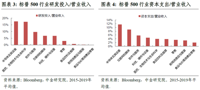 萨伊定律支配下的行业则不然,正如马斯克所讲,创新才是决定企业竞争力的根本因素。因为这些行业的需求并不是天然存在的,而是被供给“创造”出来的需求。这样一个供求关系给企业带来的好处是,只要能够不断提供优质供给,企业不会存在芒格所称“80亿*64盎司”的需求极限天花板,或者说这种需求天花板的高度是由内在的企业创新能力决定的,而不是取决于一些企业不可控的因素,例如自然或者人类的生理原因。创新对于两类企业的不同含义,造成了两类企业支出结构的较大差异,以美国标普500行业层面的数据为例,无论是在研发支出还是资本开支占比方面,具有供给创造需求特点的半导体、互联网等行业,要远高于需求决定供给的消费品行业。因此,只有不断的研发创新和提供优质供给,平台等科技企业才会有持久的生存空间。