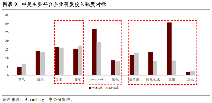 具体而言,如果某企业研发强度明显低于国外对标企业,则无法认定该企业有充分的垄断合理性;如果某企业研发投入强度在一个较长时期内(比方说5年)呈现下降态势,则认为其垄断合理性正在减弱。如上图所示,搜索平台中,百度与谷歌的研发投入强度相当;在社交平台中,腾讯的研发投入强度远逊于Facebook;在电商平台,阿里、美团研发投入强度虽一度高于亚马逊,但在过去五年亚马逊提升了研发投入强度的同时,阿里、美团的研发投入强度均出现了显著下降,京东虽有所提升,但研发强度显著低于国内和国外对标平台企业。