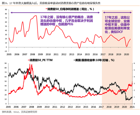 而对于消费前50这部分由全球定价的公司而言,对于它们的估值影响更大的,是全球利率水平或者说是全球流动性,即10年期美债收益率(全球流动性的总闸门在美联储)。而大家也可以看到,在2017年外资流入之前,这部分公司估值和美债利率关系并不大,2017年之后,美债收益率的波动对于消费前50公司的估值有一个比较明显的领先性。