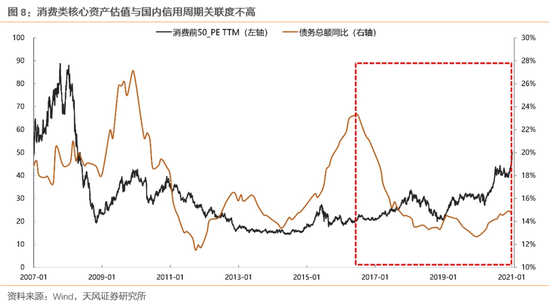 其次,针对业绩稳定的消费类核心资产,这部分公司的股价表现和国内信用周期关系也不大。我们以外资(主要是北上资金)在A股持股市值最高的50家消费+医药公司为样本,下图中的黑色线段代表这些公司的整体估值,红色线段部分则代表信用周期和银行间流动性的指标,可以看到在2017年外资大规模流入之后,也就是这部分公司核心定价逻辑由全球资金主导后,两者的关联度明显趋弱。