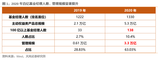 截至2019年,主动权益管理规模在100亿以上的基金经理只有33位,这33位管理人的管理规模占全市场主动权益类基金规模的28%左右。但是这个数字到2020年底已经达到138,这138位百亿基金经理管理了所有主动权益规模的63%。