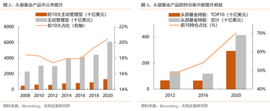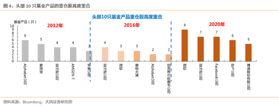 但即便如此,与美国共同基金的发展情况相比,国内公募基金的集中度仍然有进一步提升的空间——2020年美国前10大主动管理型基金产品市占率提升至20.4%(而国内公募基金前十大产品市占率为10.8%)。同时,这些基金产品持股集中度也在不断上升:一方面是前10持仓占比提升至70.2%,另一方面是重仓股的高度重合,例如2020年头部10只基金里有9只持有微软,7只持有FB和亚马逊,持仓集中度较过往也有很大提升。