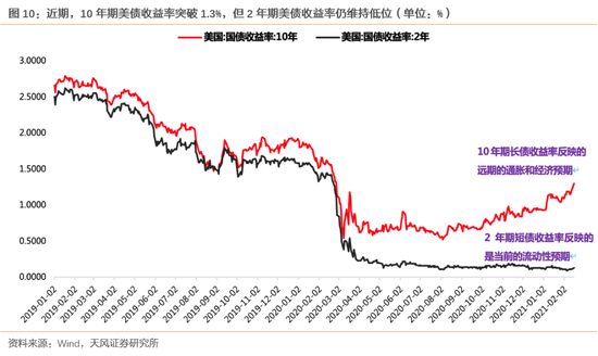 从目前来看,美债10年期突破1.3%短期内会产生一定的影响,但我们认为目前还没有到一个对核心资产造成致命影响的阶段。因为虽然10年期美债收益率在上行,但2年期美债收益率目前还维持在相对低位,这是过去4、5年以来美国长短端(10年-2年期)利率持续时间比较久的一段走势的背离,这一次的背离实际上体现了这次疫情的特殊背景给政策当局带来的不确定性。
