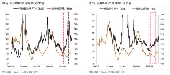 首先,对于景气周期上行的成长类核心资产,我们这里举几个例子,比如2019年的半导体设计、近2年的新能源和新能源汽车,用下面两张图可以说明,黑色的线代表这两个行业的估值,红色的线代表信用周期(比如国内社融)或银行间流动性,可以看到,2019年4月之后,信用周期收缩阶段,由于半导体业绩的快速上行,所以行业整体的估值并没有受到信用周期收缩的影响,包括近2年的新能源和新能源汽车,它们的估值上行的过程中,与信用周期的起落并无太多关联。此外,像2010年(这一阶段信用开始快速收缩)的消费电子(iPhone 3G、4问世带来的智能手机新周期)、2013年(清理非标、钱荒导致的信用收缩)的移动互联周期(以游戏、计算机为代表的公司表现均比较好)、2018年去杠杆过程中的PCB行业(5G基站建设元年),在这些例子中,都可以得到这样的结论,产业周期自身处于上行周期的行业,估值受国内流动性和信用周期的影响会比较小。这些公司最重要的还是取决于自身产业周期的位置。