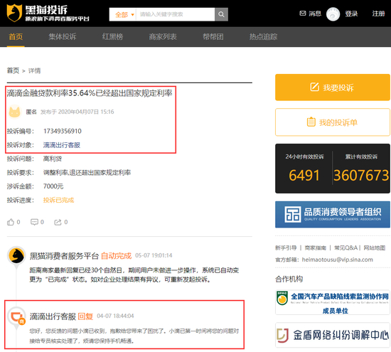 2020年4月7日,在新浪黑猫投诉平台发布了一份关于滴滴金融的贷款投诉,编号为“17349356910”,所涉及的贷款年利率高达35.64%(日利率为0.099%)。
