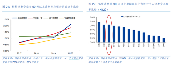 注:蚂蚁逾期率的计算扣除了已核销贷款,银行未扣除。同时,蚂蚁贷款规模一直在快速增长之中,新发贷款到产生不良有时间差,大量新增贷款加入分母会迅速稀释不良率。因此蚂蚁披露数据可能低于实际值。