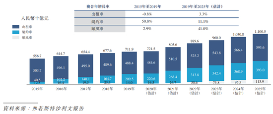 根据弗若斯特沙利文报告,2019年中国四轮出行市场的交易总额为7119亿元,其中网约车市场2095亿元,市场份额为29.43%。